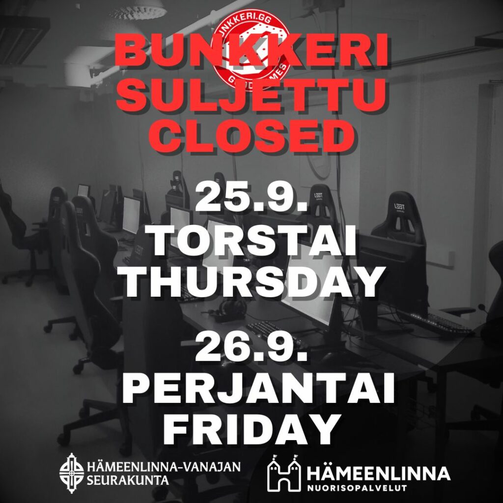 Bunkkeri on suljettuna torstaina 25.9. ja perjantaina 26.9. viikonloppuna pidettävän tietokoneleirin vuoksi.
