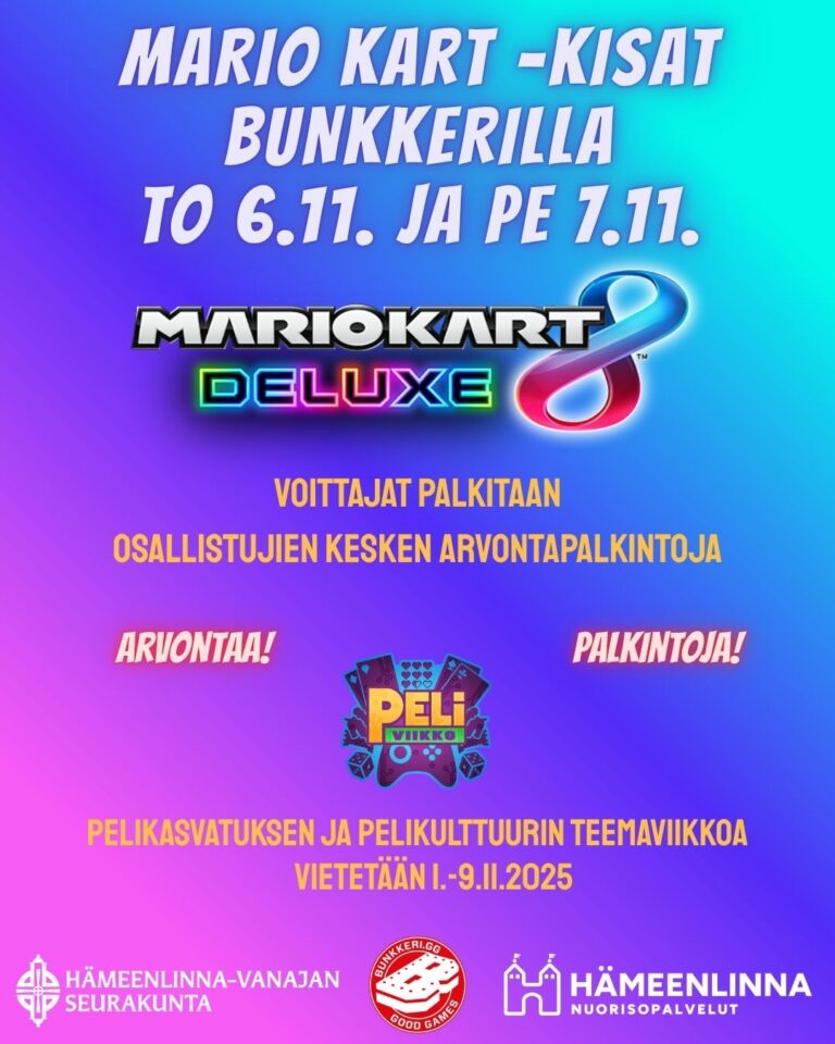 Valtakunnallinen peliviikko 1.-9.11.2025 Tavoitteena rakentaa positiivista pelikulttuuria ja kannustaa yhteisiin pelihetkiin ja keskusteluihin.6.-7.11. Bunkkeri pelitilalla kisaillaan Mario Kart -pelissä. Voittajille pieniä palkintoja ja kaikkien osallistujien kesken arvontapalkintoja.