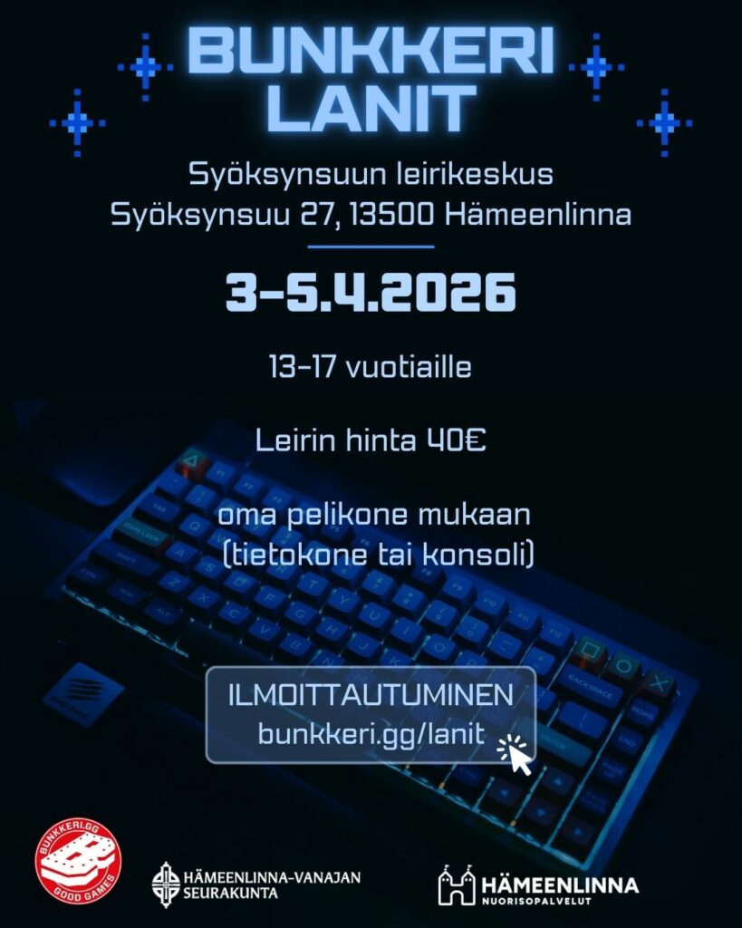 Bunkkeri lanit 3.4.-5.4.2026 Bunkkerin lanit pidetään pääsiäisenä 3-5.4.2026 Syöksynsuun leirikeskuksessa.Leirin hinta on 40€ ja se kattaa majoituksen, ruokailut sekä konepaikan. Oma pelikone (tietokone tai konsoli) mukaan.Lanit on suunnattu 13-17 vuotiaille.Ilmoittautuminen päättyy 25.3. klo 20. Bunkkeri.gg/lanit